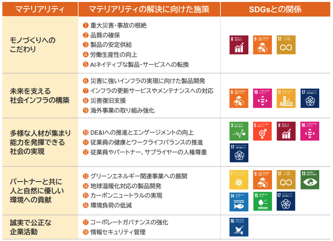 その後、経営メンバーレビューを実施し、5項目のマテリアリティとそれらの解決に向けた18項目の施策を特定しました。